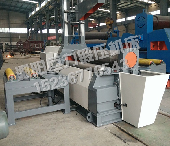 該四輥卷板機與對稱三輥卷板機比較,它可以不借助其它設備模具,直接予彎板材端部,而且剩余直邊較小;它可以不使板材調頭,而卷成工件。