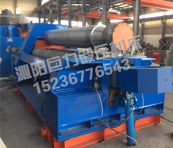 該四輥卷板機(jī)與對(duì)稱(chēng)三輥卷板機(jī)比較,它可以不借助其它設(shè)備模具,直接予彎板材端部,而且剩余直邊較小;它可以不使板材調(diào)頭,而卷成工件。